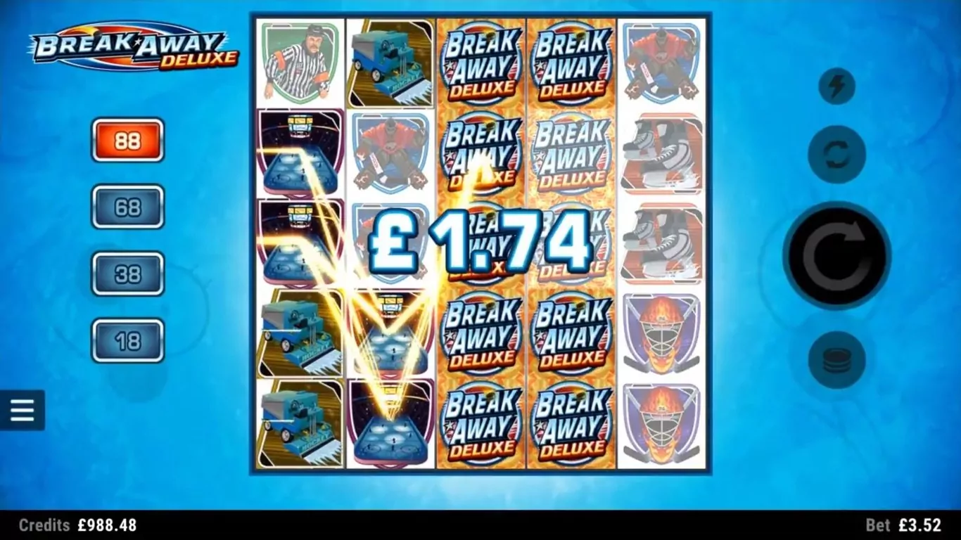 Break Away Deluxe hadir dengan desain yang sporty dan energik. Latar belakangnya menggambarkan arena es yang dingin tapi membara karena ketegangan pertandingan. Simbol-simbolnya pun khas dunia hoki: helm, sepatu seluncur, penjaga gawang, sampai aksi tabrakan antar pemain. Semua elemen ini bikin pengalaman main jadi makin nyata dan seru.