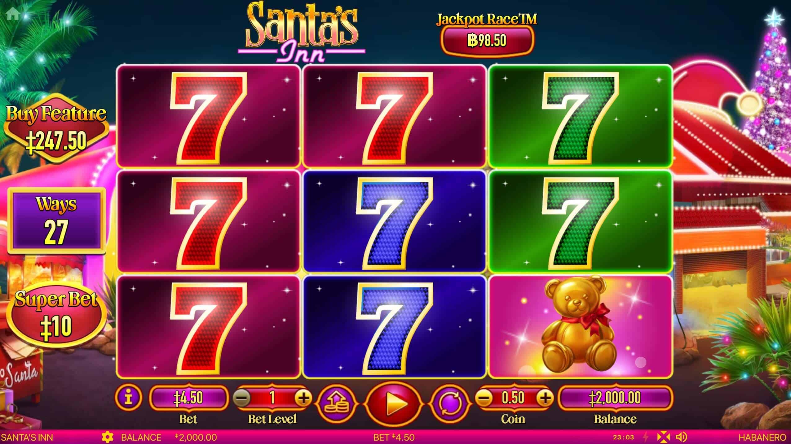 Begitu permainan dimulai, mata langsung dimanjakan oleh pemandangan penginapan yang cantik, dihiasi pohon Natal besar dan dekorasi berwarna-warni. Musik ceria berpadu dengan suara lonceng dan derap kaki Santa, membuat setiap putaran terasa seperti berada di pesta Natal sungguhan. Simbolnya pun menarik dan lucu: Santa tersenyum, hadiah berwarna cerah, kue manis, permen, dan lonceng emas, semuanya menambah kesan hangat dan menyenangkan.